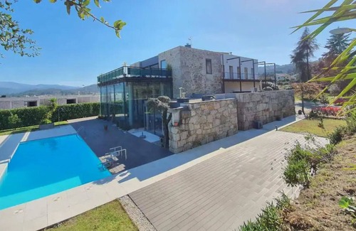 The beautiful holiday home Quinta do Nascimento is located in Celorico de Basto, a village in the scenic country side an hour's drive from Porto. The holiday home consists of a living room, a well-equipped kitchen with a dishwasher, 4 bedrooms as well as 5 bathrooms and can therefore accommodate 8 people. Additional amenities include Wi-Fi (suitable for video calls), washing machine, air conditioning, a fireplace, while a baby bed and a highchair are available on request. The stunning property feautres a balcony, pools both indoors (heated and adapted for guests with reduced mobility) and outdoors, open covered terrace spaces with a barbecue and an extensive garden - all with amazing mountain views and sunshine all around. The area offers the Ecopista do Tâmega cycling route and the nearby "Senhora da Graça" mountain top is a popular attraction. A supermarket, a pharmacy as well as some cafés and restaurants are within a few minutes on foot from the property. Within one hour by car, you can reach the wonderful city of Porto with several beaches along its coastline. Braga is also a one-hour drive away.