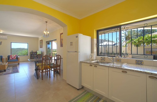 "Quinta do Mosaico", 3-room house 85 m2. Renovated in 2020, beautiful and tasteful furnishings: living/dining room with open-hearth fireplace, dining table, satellite TV, air conditioning and forced-air heating. Exit to the terrace. 1 room with 1 french bed (160 cm, length 200 cm), electric heater and fan. 1 room with 2 beds (90 cm, length 190 cm), electric heater and fan. Open kitchen (4 hot plates, oven, dishwasher, toaster, microwave, electric coffee machine). Bath/WC. Underfloor heating. Heating not available in all rooms. Natural stone floors. Terrace 46 m2 partly roofed. Terrace furniture, barbecue, deck chairs (4). Panoramic view. Facilities: washing machine, dryer, children's high chair, baby cot. Internet (WiFi, free). Please note: non-smokers only. Private entrance, fire extinguisher. 108534/AL
