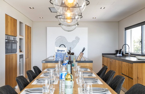 Spend your holiday on a high point at Villa da Raposa. Perched above the Atlantic, this self-contained clifftop oceanview villa affords stunning views over the water, plus a location close to one of the Algarve’s best beaches.The attractive Villa da Raposa is equipped with every luxury and comfort you can think of. On a beautiful spot in the Algarve, the view will also amaze you. The view over the ocean and the beach with the coast of Sagres in the distance ... truly breathtaking.The private heatable swimming pool with an interior sitting area in the water to enjoy the view, the jacuzzi and also the beautiful beaches and various things to do within a short distance make this villa a unique holiday spot!Living area | KitchenA sparkling pool, loungers, barbecue and al-fresco dining for eight let you entertain or relax from dawn to dusk. After dark, watch the stars come out or step inside to enjoy the television, PlayStation and Wi-Fi in the lovely spacious living room with a fireplace.There are two large sofas, and a separate corner for the children, with their own television and a lovely 'plop' sofa so they will be able to enjoy themselves with the PlayStation.Very spacious kitchen with a cosy 4m long kitchen table that seats 10 peopleVilla da Raposa has a very spacious fully equipped kitchen with a cosy 4m table that seats at 10 people.Ground floorThe front door gives you access to a spacious hall. On this level there are 4 bedrooms:Bedroom 1: King size bed, ensuite bathroom with rain shower, air conditioningBedroom 2: King size bed, ensuite bathroom with rain shower, air conditioningBedroom 3: Two single beds, shared bathroom with bedroom 4, air conditioningBedroom 4: Two single beds, shared bathroom with bedroom 3, air conditioningBasement floorHere you find the other two bedrooms:Bedroom 5: King size bed, shared bathroom with bedroom 6, air conditioningBedroom 6: Two single beds, shared bathroom with bedroom 5, air conditioningAlso on this floor, there is a second relax area with a ping pong table and the laundry room with washing machine and tumble dryer.OutsideRelax under the Mediterranean sun with friends and family, stretching out on a lounger, swimming in the pool or sipping refreshments around a large al-fresco table for 12 people. The outdoor areas also feature a Green Egg barbecue, jacuzzi and a breathtaking rooftop terrace.Amenities:- Private pool- Air conditioning (in all rooms)- Rooftop lounge area- Sunloungers- Alfresco dining- Jacuzzi- Elevator- Green egg barbecue- Washing machine- Tumble dryer- Hairdryers- Wine cooler- Playstation- Private parking- Wifi- Oceanview- Fenced gardenDistances:- Cascade Golf Resort (Driving range only) 150 meter- Restaurant 700 meter- Praia do Porto de Mós 1.1 km- Pizzeria 1.3 km- Praia da Dona Ana 1.8 km- Supermarket 2.4 km - Logos town centre 2.9 km- Lagos Zoo 15.1 km - Slide & Splash 34.7 km - Faro Airport 81.6 km Included in rental price:- Gas / water / electricity- Bedding & towels- Jacuzzi- Pool towels- Air conditioning in all rooms- Underfloor heating- Fast wifi- High chair and cot- Midweek towel refresh Excluded in rental price:- Refundable security deposit: € 1.250,-- Pool heating: € 600,- per weekWe are always near to assist :-)Lagos and the AlgarveLet’s think of the sea, of light, and beaches flanked by steep cliffs and landscapes that take one’s breath away. Let’s think of incomparable wild beauty, the smooth breeze that brings with it stories that fill us with awe, and of the pleasure of experiencing a rich and exceptionally varied cuisine. This is what we find in Lagos.Located on the west part of the Algarve – known as Barlavento or the windward part – the city of Lagos maintains its traces of authenticity with the walls of the historic centre reminding us of the past. For centuries, the city found its identity and its livelihood from the sea, a history echoed in the city. It was from here that, at the time of the discoveries, many vessels and navigators left in search of new worlds.Today, Lagos is a destination of excellence, not only due to its picturesque streets but also and mainly due to the extraordinary natural landscapes and Atlantic beaches of great beauty. The best place for Villa da Raposa!!We recommend to hire a car to explore the beautiful Algarve.** Please note that we accept a maximum of 8 adults. A family of 8 adults + 4 children is more than welcome of course :-)