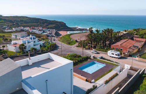 Villa Sapateira is a dream house in a fantastic beach location with unique sea views from the very spacious terrace and from almost every bedroom. Enjoy unforgettable sunsets with a drink every day! The furnishings are very tasteful and upscale. The beach can be reached on foot in just 5 minutes.On the ground floor there is a large living room with views over the heated swimming pool to the Atlantic Ocean. The fully equipped kitchen has a separate outside area (terrace), where you can dine protected from the wind and use the grill and pizza oven. Behind the house you will find a terrace that offers morning sun for a delicious breakfast.On the same floor there is a double bedroom and a shared bathroom. On the first floor of the house are the three exclusively furnished suites, each with a private bathroom, two of which have a private terrace and sea views. The fifth double room is on the lower level of the villa and shares the bathroom on the ground floor. In total, 4 bedrooms have double beds (1.80m wide) and one bedroom has two single beds.The large glass front of the kitchen leads directly to the terrace with barbecue area to the side of the swimming pool. From the living room you can reach the other part of the large terrace where you can find the swimming pool and the sun loungers. At the top, the house surprises with a huge rooftop and 360° view of the complex and the entire beach resort. From here you can watch unforgettable sunsets.